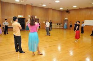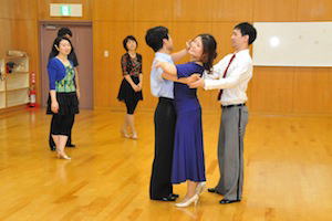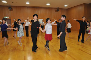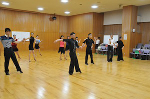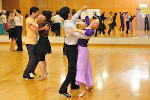 スタンダード&ラテンの曲が順番にかかり、 色々な方と自由に組んでの練習となります。 初心者の方には、ベテランの会員が積極的に声をかけるようにしています。 |
